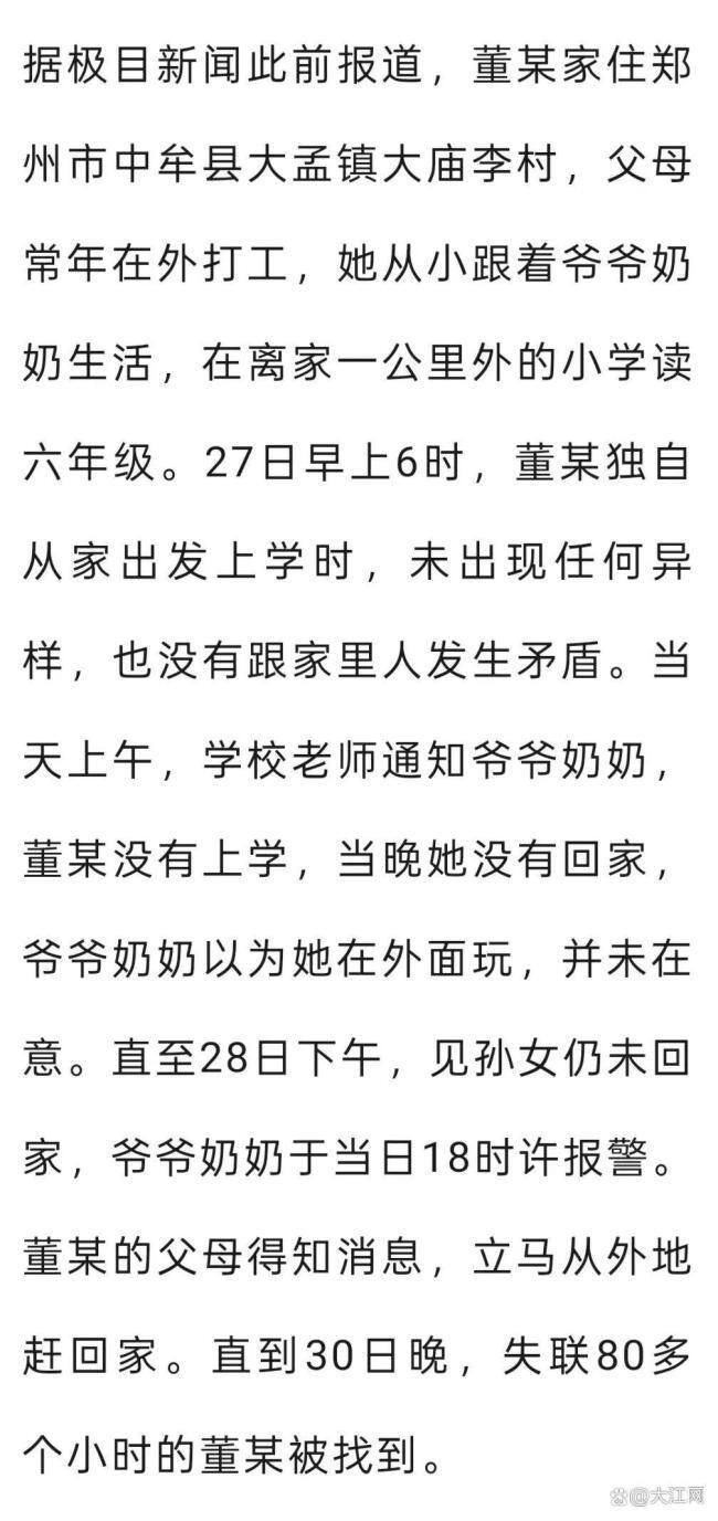 郑州失联超80小时的12岁女孩已找到!在河南郑州中牟县失联超过80个小时的12岁女孩董某已被找到。10月30日晚,董某平安返回家中。据中牟警方透露,经过大量细致的工作,他们最终找到了董某。董某表示自己...