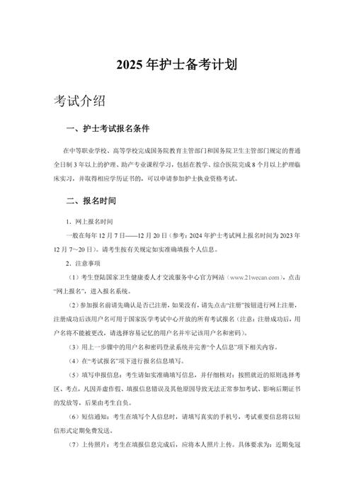 4、利用《全国护士执业资格考试》习题集进行练习:做题是检验复习效果的有效手段。通过大量做题,可以加深对知识点的理解和记忆,同时熟悉考试的题型和难度,为实际考试做好充分准备。明确考试内容与结构 了解考试科目与时间:护士资格考试每年5月份举行,考试科目包括专业实务和实践能力两科,每科120题。