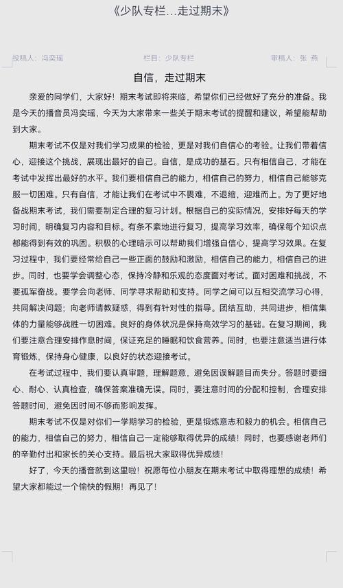 用好的心态对待期末考试,可以从以下几个方面进行调整:保持轻松心态 考前保持轻松的心态至关重要。不要过度紧张和焦虑,可以通过深呼吸、冥想等方式来缓解压力。要相信自己已经做了充分的准备,只需尽力发挥即可。合理安排时间 考生应合理安排时间,既要保证复习的效率,也要确保充足的休息。