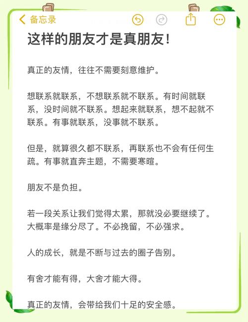 首先,相处自然。好朋友之间的相处应当是自然而然的,无需刻意维持或过分在意。在开心顺利的时候,或许不会时刻想起对方,但在遇到挫折或需要倾诉时,对方会自然而然地成为你的依靠。这种自然的状态让友谊更加真实和持久。其次,无负担的求助与支持。