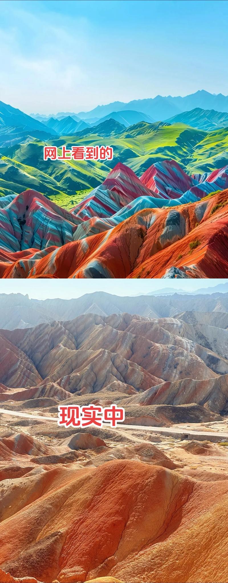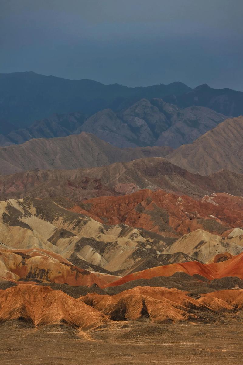 4、由来地质成因:七彩丹霞位于甘肃张掖,是白垩纪红层(35亿年 - 6500万年前)经地壳运动、流水侵蚀、风化剥蚀及风力作用形成的丹霞地貌与彩色丘陵复合区。岩层中不同矿物成分(如铁、锰氧化物)呈现红、黄、绿、灰黑等色调,晨昏时分光影下形成“七彩屏”“七彩锦绣”等震撼景观。