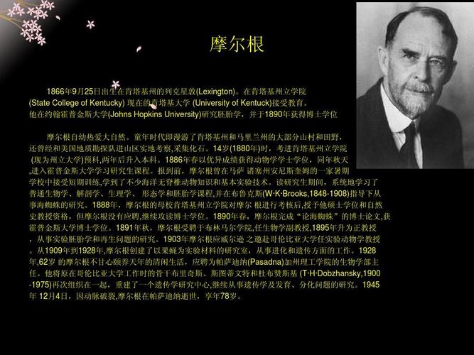 摩尔根进行了著名的果蝇实验。他于1866年9月25日出生于美国肯塔基州的列克星敦。摩尔根在肯塔基大学接受教育,并在约翰霍普金斯大学研究胚胎学,获得了博士学位。他对自然界有着浓厚的兴趣。实验背景:1910年5月,摩尔根的实验室中出现了一只白眼雄性果蝇。他将这只果蝇带回家,并将其放在床边的瓶子中,白天则带回实验室。