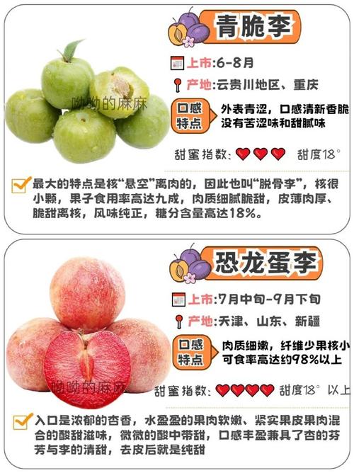果实特性:李子:李子的果实大小适中,熟透后肉质偏软。青梅:青梅是果梅树的果实,果实较大,肉质厚且稍脆。口感:李子:一般是甜中带酸,熟透的李子偏甜。未熟的李子可能酸味较重。青梅:酸中带甜,口感独特。药用价值:李子:药用价值较高,能促进肠胃蠕动,帮助消化。