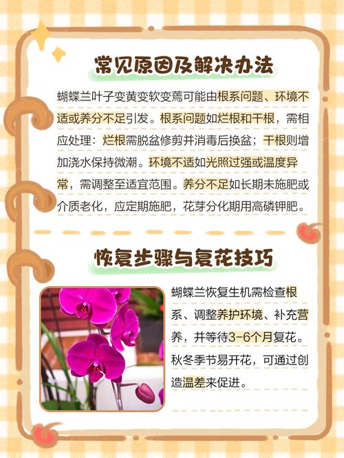 2、更换土壤重新种植:处理完兰花后,重新更换土壤进行种植。放在阴凉处养护:兰花叶子蔫了可能是因为强烈阳光导致脱水,所以最好将兰花放在阴凉处进行细心养护。适量浇水:每隔3~5天浇一次水,阴雨天时需停止浇水,以防止兰花叶子继续发焉。