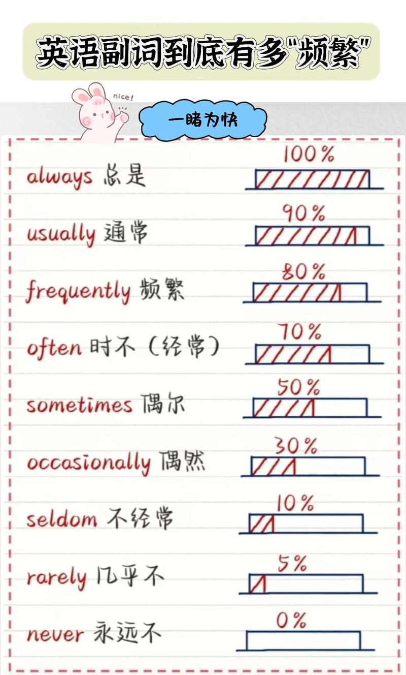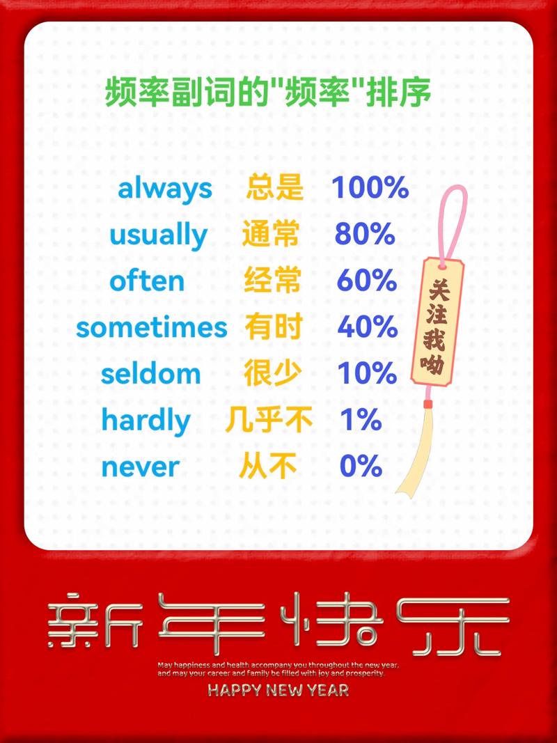4、频度副词是用来表示动作频率的词。以下是对频度副词的详细解释:定义与功能 定义:频度副词在英文中专门用于描述动作发生的频率,即某动作是经常、偶尔还是总是等发生的。功能:它们为句子提供了关于动作发生频率的重要信息,有助于读者或听者理解动作发生的规律性和频率。