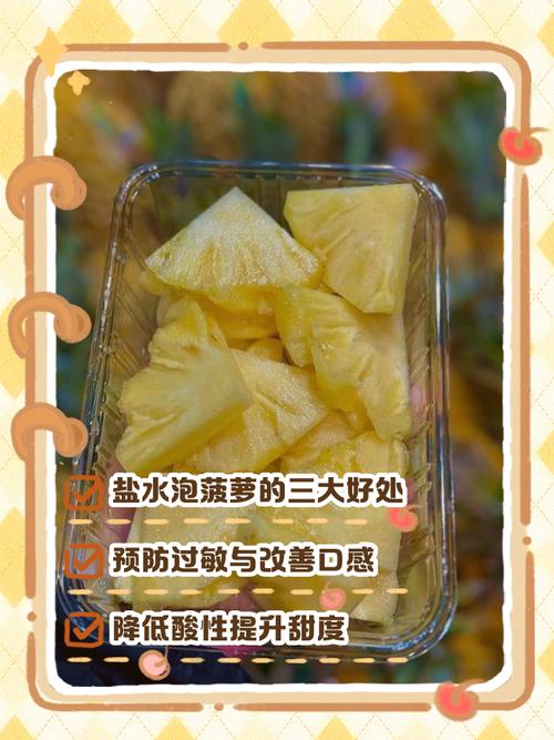 3、菠萝在盐水里泡30分钟左右就可以吃。这样处理后的菠萝不仅能保持其新鲜口味,还能达到去过敏的目的。以下是关于菠萝泡盐水的一些详细解释和建议:浸泡时间 将切成片或块的菠萝放入盐水中浸泡,时间控制在30分钟左右为宜。这个时间段足以让盐水渗透到菠萝内部,起到去涩和去过敏物质的作用。