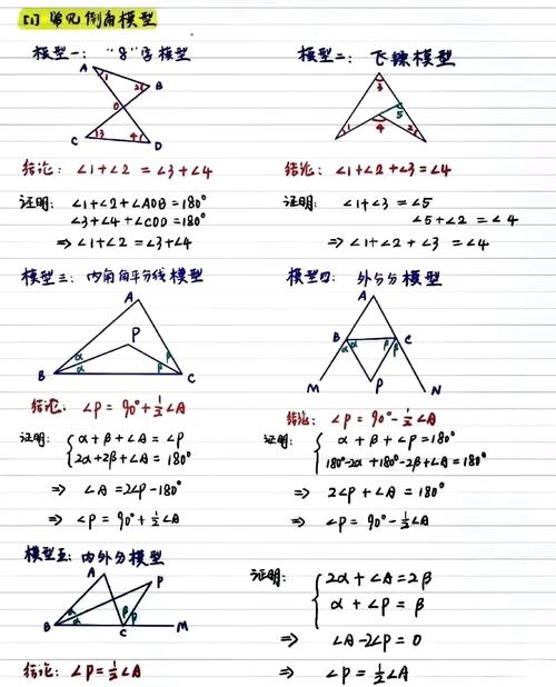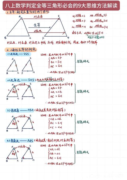 边边边全等(SSS):如果两个三角形的三边长度分别相等,则这两个三角形全等。这是全等三角形最基本的一种判定方法。边角边全等(SAS):如果两个三角形的两边长度相等,并且这两边所夹的角也相等,则这两个三角形全等。