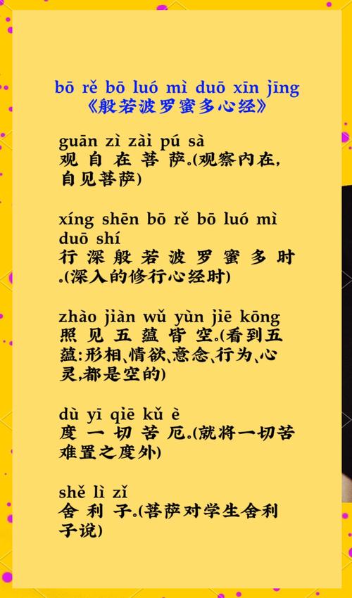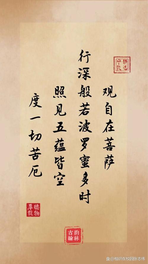 3、《心经》详解如下:观自在菩萨的觉悟之旅:菩萨以般若波罗蜜多的智慧为指引,开始其觉悟之旅,成为具有洞见和悲愿的探索者。深入般若的智慧海洋:“行深般若波罗蜜多”意味着对智慧的深入挖掘与精进实践,超越表象,直指本质。五蕴皆空的洞察:菩萨以般若慧识破五蕴为空,揭示世间万物虚幻的本质。