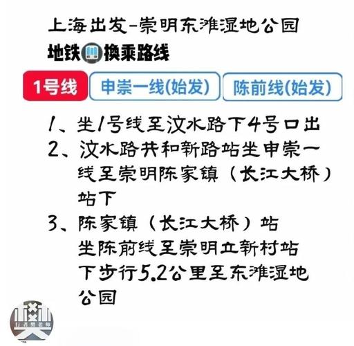 5、去崇明岛可选择的公交线路及地铁换乘方式如下:从上海虹桥站到崇明岛:乘坐地铁2号线从虹桥火车站到达世纪大道站。在世纪大道站换乘地铁6号线,到达五洲大道站。在五洲大道站乘坐申崇六线,到达崇明岛的育麟桥路西门路站。从上海站到崇明岛:乘坐地铁1号线从上海火车站到达汶水路站。