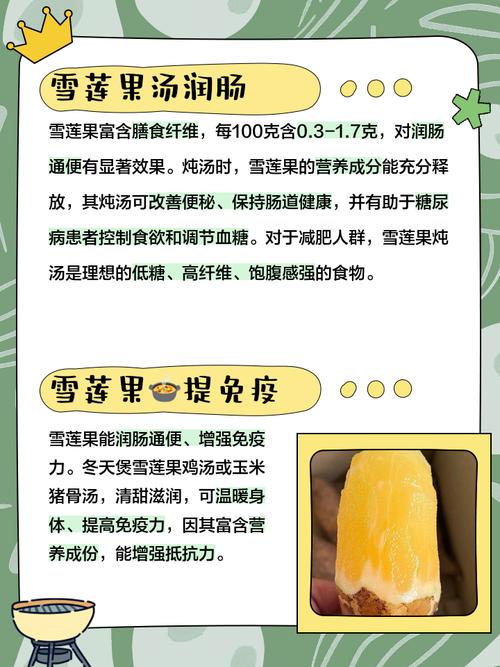 雪莲果瘦肉汤,材料:雪莲果1个,猪肉400克,胡萝卜1个,玉米1个,生姜5片。做法:将雪莲果洗净,削皮,切小块。胡萝卜、玉米洗净,剁成块。将猪肉洗净,切片,放在水中焯一下。然后将以上所有食材放在砂锅中,倒入清水。大火煮沸,改小火煮2小时左右。然后加入食盐调味即可。