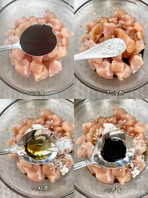 3、宫保鸡丁的酱汁调制超简单,按照这个配方,你也能调出那独特的味道哦!加盐:先来一勺盐,给酱汁打个底味。加糖:接着加入三勺糖,让酱汁甜丝丝的,和后面的酸味形成对比,超赞的!加鸡粉:再来一勺鸡粉,提鲜效果杠杠的!加酱油:别忘了一勺酱油,给酱汁上个色,味道也更浓郁了。