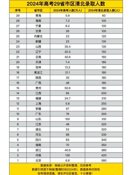 清华大学和北京大学:河南省:在2024年高考后,河南省以420名清北录取人数位居前列,显示出该省在清北录取上的强劲实力。浙江省:以380人的录取成绩紧随河南省之后,位列第二,同样表现出较高的教育水平和竞争力。