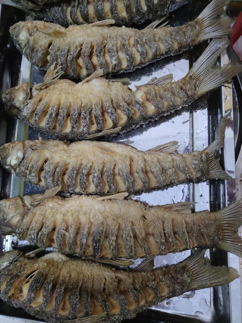 5、接下来是制作步骤:首先,将鱼收拾干净,然后在鱼身两面剞上较浅的斜刀纹。接着,将锅内放入色拉油,烧至八成热后,分次将鱼放入油内炸至金黄色,捞出沥油。在另一个锅内垫上铁箅,铺上葱、姜,将炸好的鲫鱼摆放入内,添加适量的鲜汤,随后加入所有调味料。