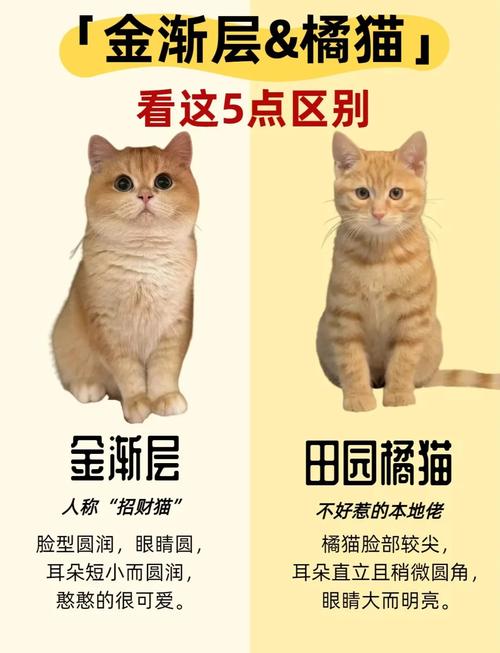 2、辨别橘猫和土猫的方法主要有以下三点: 品种区别:土猫:通常指的是中华田园猫,这是一种本土的自然猫种,外表主要呈现橘黄色。它们没有特定的品种标准,因此在外形上可能有一定的多样性。橘猫:在宠物领域,橘猫一般指的是英短金渐层,这是一种经过人工选育的宠物猫咪品种。