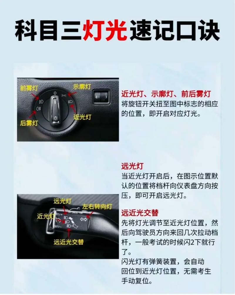 1、驾考新规, 科目三灯光考试技巧, 牢记!第2条:同方西近距离跟车行驶。(近光灯)2018驾考新规, 科目三灯光考试技巧, 牢记!第3条:夜间通过急弯,坡道、拱桥、人行横道。(远近光灯切换)这句提示语音需要注意,有四句话,千万不要着急抢在语言结束前进行都能光操作。