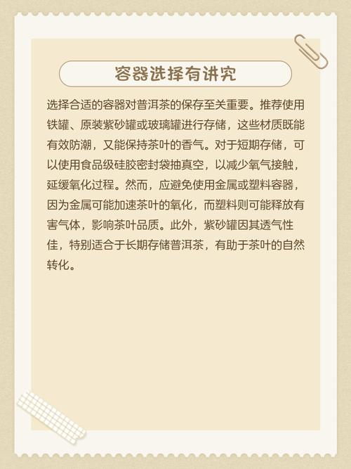 3、普洱茶长期保存需从环境控制、容器选择、分类与存放技巧、关键禁忌几个方面入手。环境控制要将普洱茶存放于阴凉处,避免阳光直射或强灯光照射,可用纸箱、陶罐遮光。环境湿度控制在50%-75%,南方需防潮,可放干燥剂;北方需防过度干燥,可置湿毛巾调节。