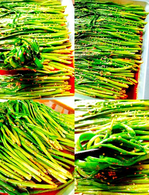 3、腌制酸香韭菜根的步骤如下: 准备韭菜根 洗净并切条:首先,将韭菜根洗净,确保去除表面的泥土和杂质,然后将其切成小条,以便于腌制时更好地入味。 加入佐料 撒入调料:在切好的韭菜根中撒入适量的盐、茴香粉、辣椒粉和花椒粉。这些调料不仅能增添风味,还能促进韭菜根的发酵过程。