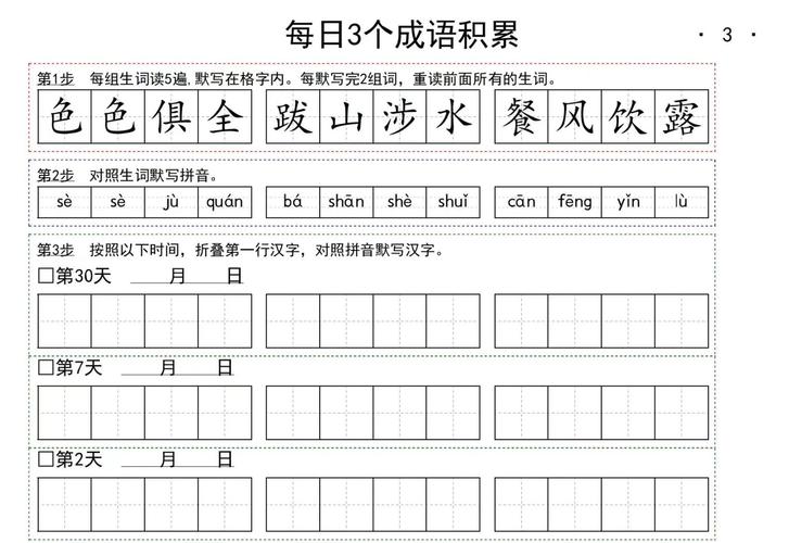 3、包含数字的四字成语 三心二意 解释:指一个人的心意不坚定,犹豫不决,常用来形容人意志不坚定,做事不专心。 五颜六色 解释:指各种颜色。常用来形容色彩繁多、丰富多彩。也可形容生活或事物的多姿多彩。与学习相关的四字成语 这些成语有助于一年级学生理解学习的态度和重要性。
