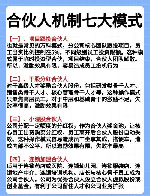 4、灵活的组织形式,便于快速决策和调整。可以享受税收优惠。劣势:合伙人之间的分歧可能影响企业经营。连带责任可能导致个人资产风险。退出机制可能相对复杂,需要遵守协议和法律规定。总之,合伙企业是一种基于共同投资、共同经营、共享收益与共担风险的企业组织形式,具有其独特的优势和劣势。