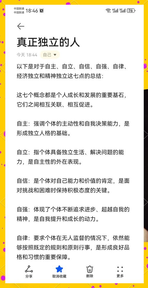 学会独立决策人生 自立的第一步是学会独立思考和做决定。一个思想独立的人,能够随时随地发表自己的意见,形成自己的思考,而不是由他人为自己做决定。例如,电影《流浪地球》的成功,就是一群有主见的人坚持自己的看法,将这部科幻巨作呈现在观众面前。