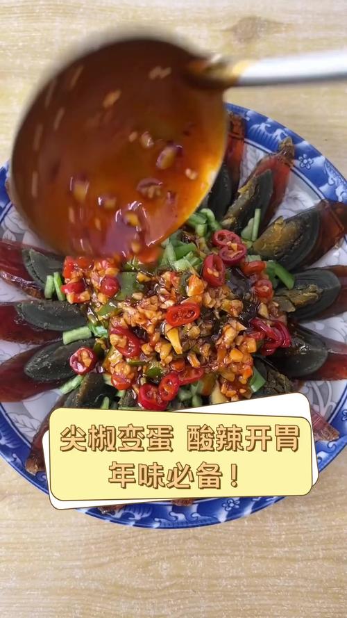 2、四川青椒皮蛋的制作方法如下:准备材料 变蛋:选择有一定弹性,未完全液化的变蛋,这样的变蛋口感更佳。将变蛋去壳,用温水洗净。青椒:洗净青椒,切成较细的沫,但注意不要切得过细,以便于入味且方便用筷子夹取。切割变蛋 将洗净的变蛋对切成半,或为了更好入味,建议切成四分之一瓣。