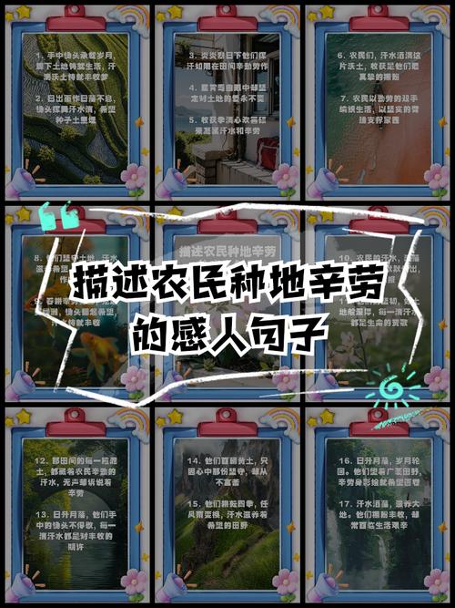 2、关于表达干农活的心情,以下是一些可以参考的说说句子:期待与迫切:开春了,农民伯伯都要下地干活了,再不放开手脚大干一场,今年真的要喝西北风了。春暖花开,又是期待天真的一天天都暖和起来,可以下地干活啦。