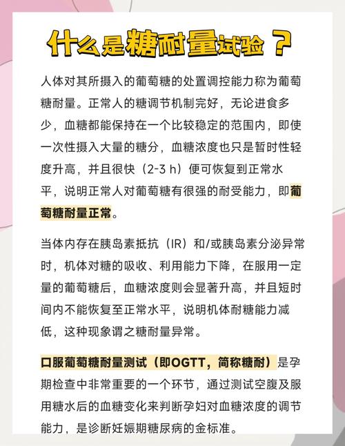 糖耐量试验是一种检测葡萄糖代谢功能的试验,其临床意义在于诊断糖尿病、判断糖耐量异常以及鉴别相关疾病。以下是关于糖耐量试验及其临床意义的详细解糖耐量试验的定义 葡萄糖耐量试验主要用于诊断症状不明显或血糖升高不明显的可疑糖尿病。
