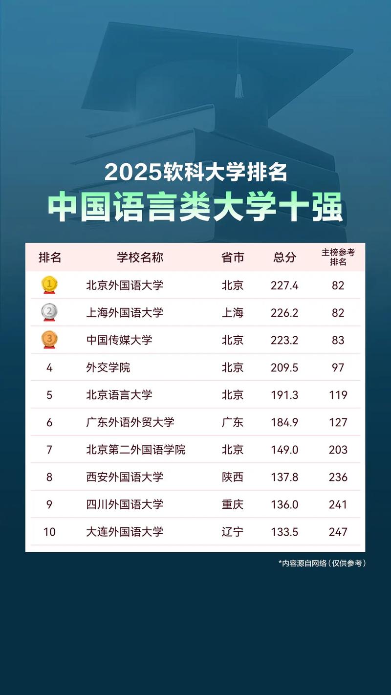 北京外国语大学位列第二。北京外国语大学同样多次跻身全国百强,2024年全国排名第80名,其语言类专业的实力和影响力不言而喻。北京语言大学排行第三,2024年全国排名第108名。此外,上海外国语大学、外交学院等也位列前十,分别排名第四和第五。
