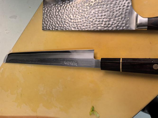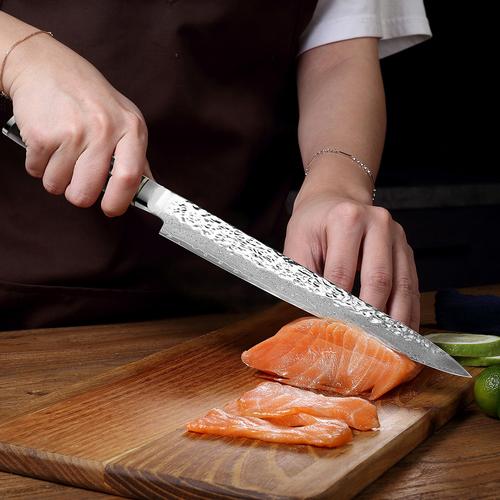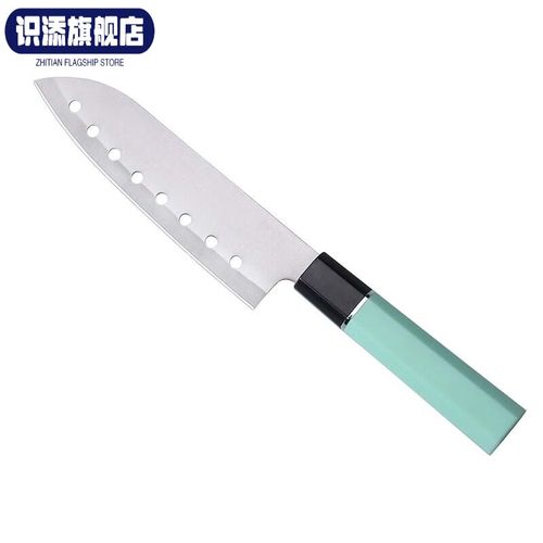 5、寿司刀有孔的原因及有孔菜刀的优点: 减少粘连:孔洞设计能减少刀刃与食材的接触面积,从而降低食材粘连在刀刃上的可能性。 清除碎屑:孔洞有助于清除切面残留的碎屑,保持刀刃的清洁。 防锈保护:这样的设计使得刀刃更易干燥,减少了生锈的风险。