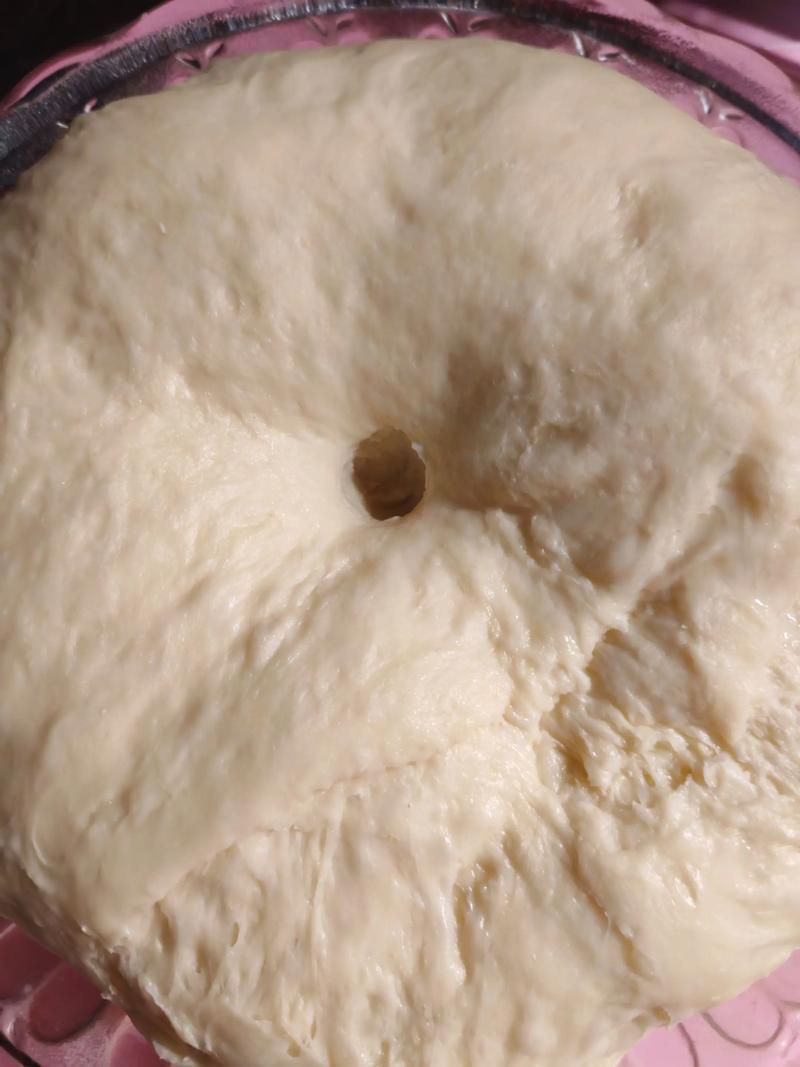选择菜单9和面功能,和面完成后放置30分钟以上。在面包桶对角放入糖和盐。黄油融化后倒入桶中,余下部分刷在桶壁上。在面团中间挖一小洞,放入酵母。选择菜单1主食面包,烧色选择浅。约5小时后,听到提示音可选择放入葡萄干、核桃等。等待面包完成。