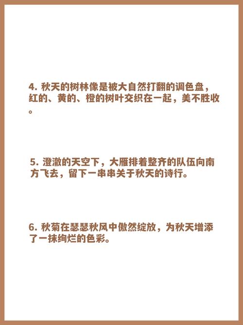 2、宜人的气候:秋天的气候宜人,既不像夏天那样炎热,也不像冬天那样寒冷。它是冷暖适中的季节,给人一种舒适和宁静的感觉。秋天的天空湛蓝,云朵洁白,空气清新,使得人们的心情也变得愉快起来。色彩斑斓的景色:秋天的景色如诗如画,各种树叶变成了黄色、红色和棕色,形成了一幅幅五彩斑斓的画卷。