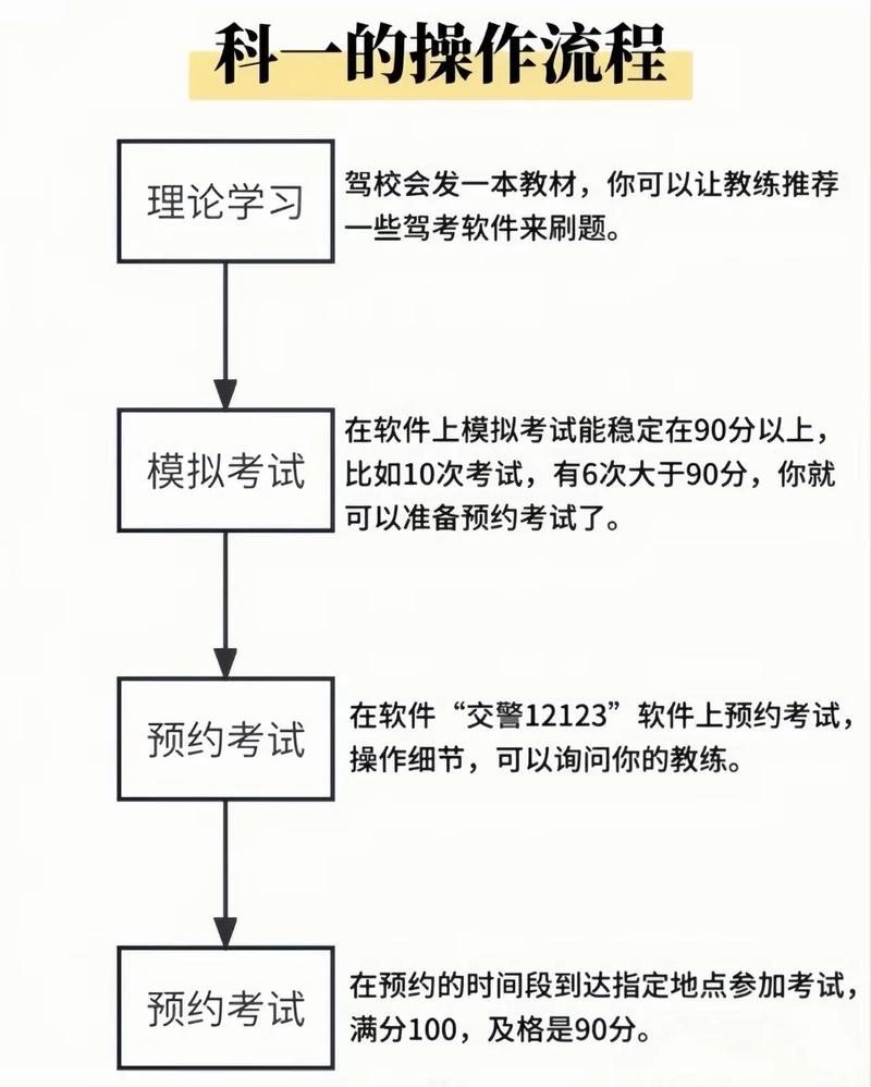 1、评分标准与合格线:满分100分,90分合格。不合格可以当场补考一次,如仍旧不合格,只能再次预约考试时间(科目一没有补考次数限制)。学习应考 无需购买书籍或参加讲座:驾考的理论考试难度适中,一般城市的通过率都在90%以上。因此,无需过于担心,也无需购买额外的书籍或参加讲座班。