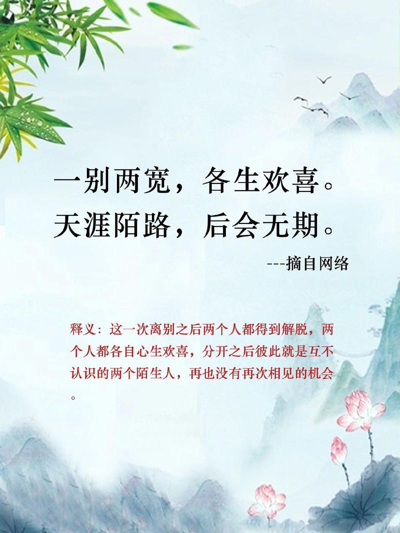 -45】得即高歌失即休,多愁多恨亦悠悠,今朝有酒今朝醉,明日愁来明日愁。-46】直道相思了无益,未妨惆怅是清狂。-47】看那天地日月,恒静无言;青山长河,世代绵延;就像在我心中,你从未离去,也从未改变。-48】就这样吧,从此山水不相逢。-49】人天自两空,何相忘,何笑何惊人。-50】既不回头,何必不忘。