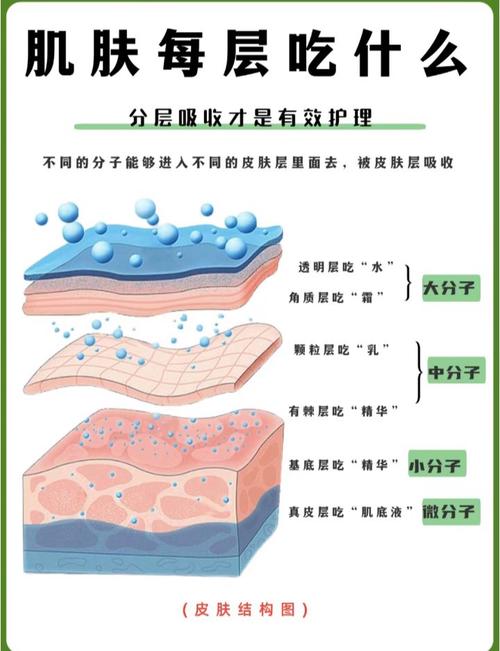 1、角质层:适合护肤品:霜作用:角质层是皮肤的最外层,主要起保护作用。使用霜类护肤品可以帮助锁住水分,防止皮肤干燥起皮屑,减少干纹的产生。透明层:适合护肤品:补水产品作用:透明层富含水分,对维持皮肤的保水能力和光泽至关重要。缺乏水分会导致透明层死亡,影响皮肤的整体状态。