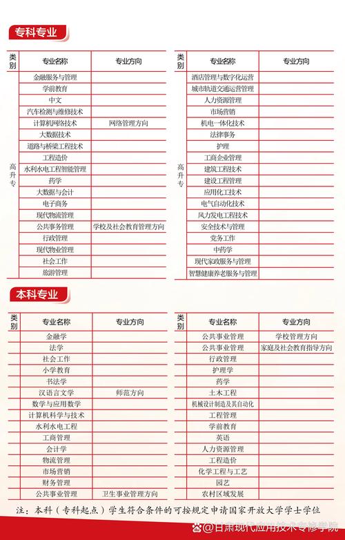 4、国家开放大学的专科专业中,法学、会计学、学前教育、行政管理、计算机信息管理、工商管理和建筑施工管理等专业颇受欢迎。这些专业涵盖了法律、管理、教育、信息技术等多个领域,为学生提供了多样化的学习选择。而在本科专业方面,行政管理、会计学、学前教育和土木工程是较为热门的选择。