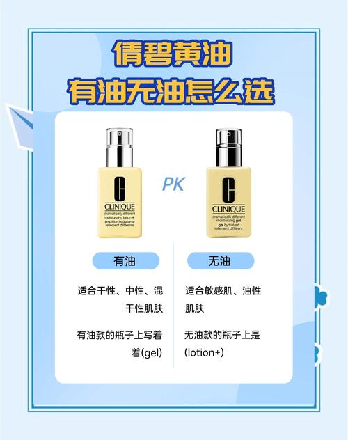 倩碧小黄油有油和无油的区别:版本与适用肤质:倩碧小黄油分为有油(lotion)和无油(gel)两个版本。有油版适合偏干至干性皮肤(包括混合性偏干肤质),无油版则更适合偏油性肌肤(包括混合性偏油肤质)。