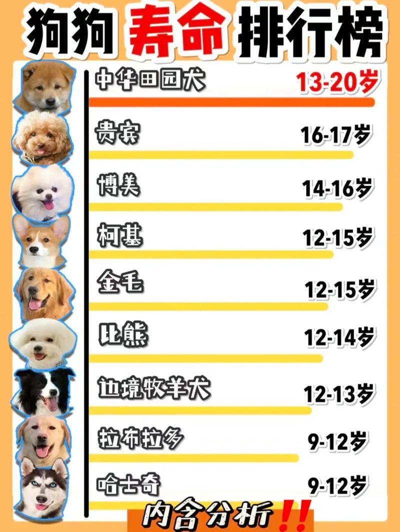 狗狗寿命排行如下:吉娃娃:寿命为1517岁,是美国最受欢迎的品种犬之一,功用广泛,可以是宗教的守护者,也是平民的好伴侣。贵宾犬:寿命为1418年,根据体型大小分为巨型犬、标准犬、迷你犬、玩具犬四种,外表可爱,给人喜悦的感觉。