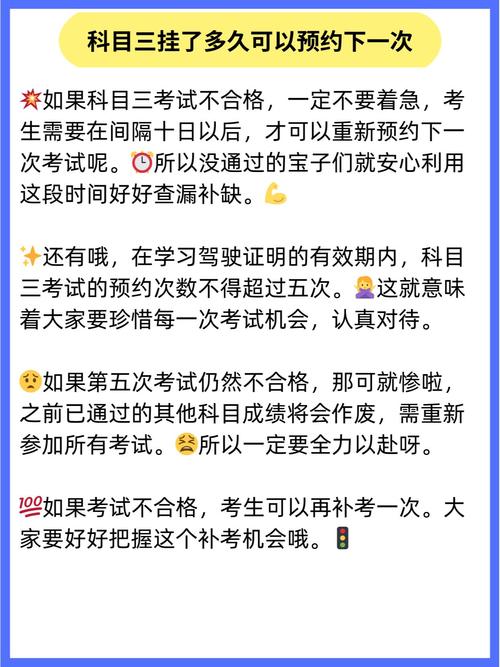 1、补考时间规定 根据《机动车驾驶证申领和使用规定》的相关规定,科目三考试不合格的申请人,需要在十日以后方可重新预约考试。这一规定是为了确保考生有足够的时间进行复习和调整,以提高下次考试的成功率。补考次数与流程 补考次数:科目三考试不合格的,可以申请补考一次。