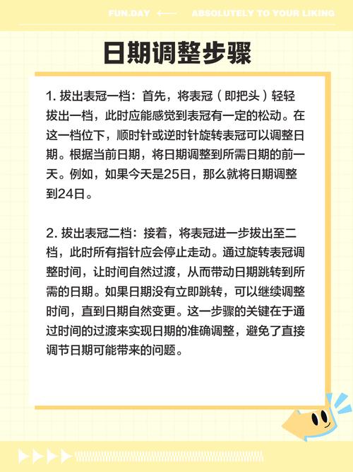 2、浪琴军旗手表调时间日期的方法如下:最佳调整时间:建议在时针指向5到8点之间进行日期和时间的调整,以避免损坏内部机械结构。调整日期:将手表的12点钟方向朝上,轻轻拔出表把第一截。此时,可以旋转表把来调整日期。注意,要顺时针旋转表把以避免逆时针调整导致日期机构损坏。