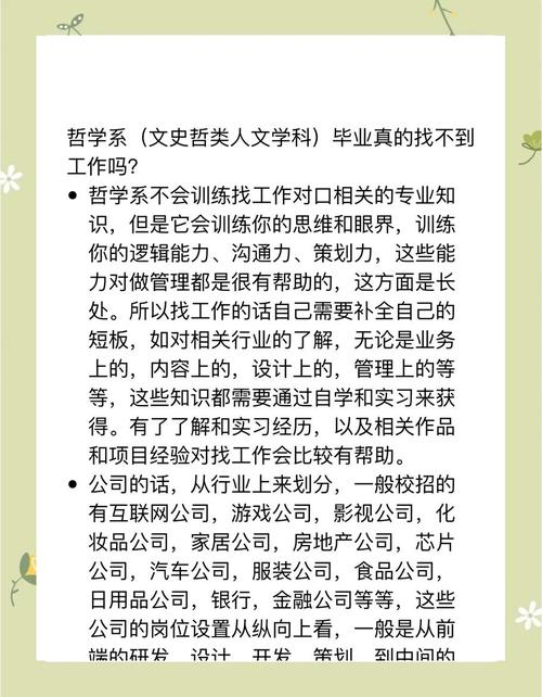 其他就业方向 除了以上几个主要的就业方向外,哲学专业的毕业生还可以选择进入企业、非营利组织等领域工作。他们可以利用自己的专业知识和思维能力,在这些领域中发挥自己的特长和优势。虽然这些岗位可能不是哲学专业的直接对口岗位,但哲学专业所培养的综合素质和能力却能够为毕业生在这些岗位上取得成功提供有力的支持。