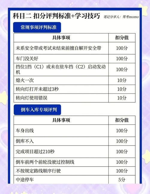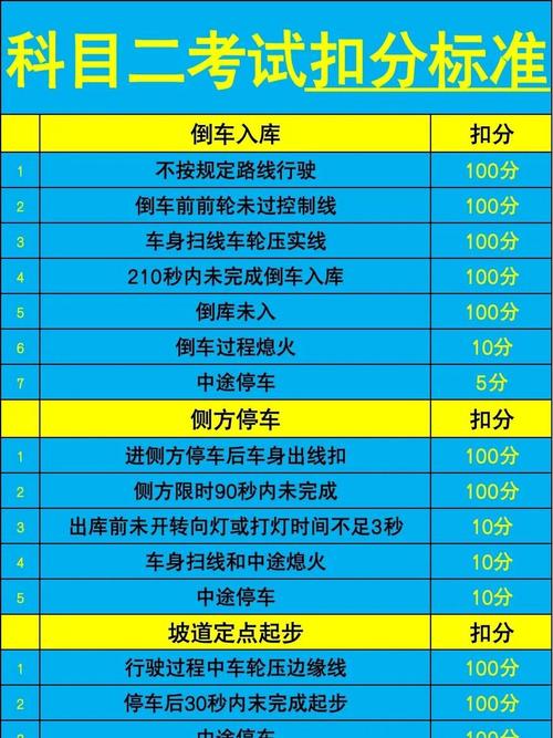 6、科目一考试满分为100分,成绩达到90分即为合格。这意味着,考生需要在交通规则、道路标志、安全驾驶知识等方面有扎实的掌握,并且能够在考试中准确应用这些知识。科目二考试同样满分为100分,但对于不同准驾车型,合格标准有所不同。