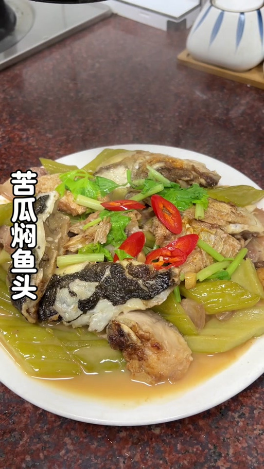 2、苦瓜 1条 咸菜 半个 姜丝 若干 大蒜苗 若干 苦瓜咸菜焖麻鱼头的做法 麻鱼头去鳃,洗净,剁块。备用。苦瓜,咸菜切条,蒜苗切段,将蒜白和蒜叶分开放。放油起锅,爆香姜丝,蒜白。鱼头粘少许生粉放入锅中煎至双面金黄。将苦瓜,咸菜放入,加入水,水量以淹没材料面。