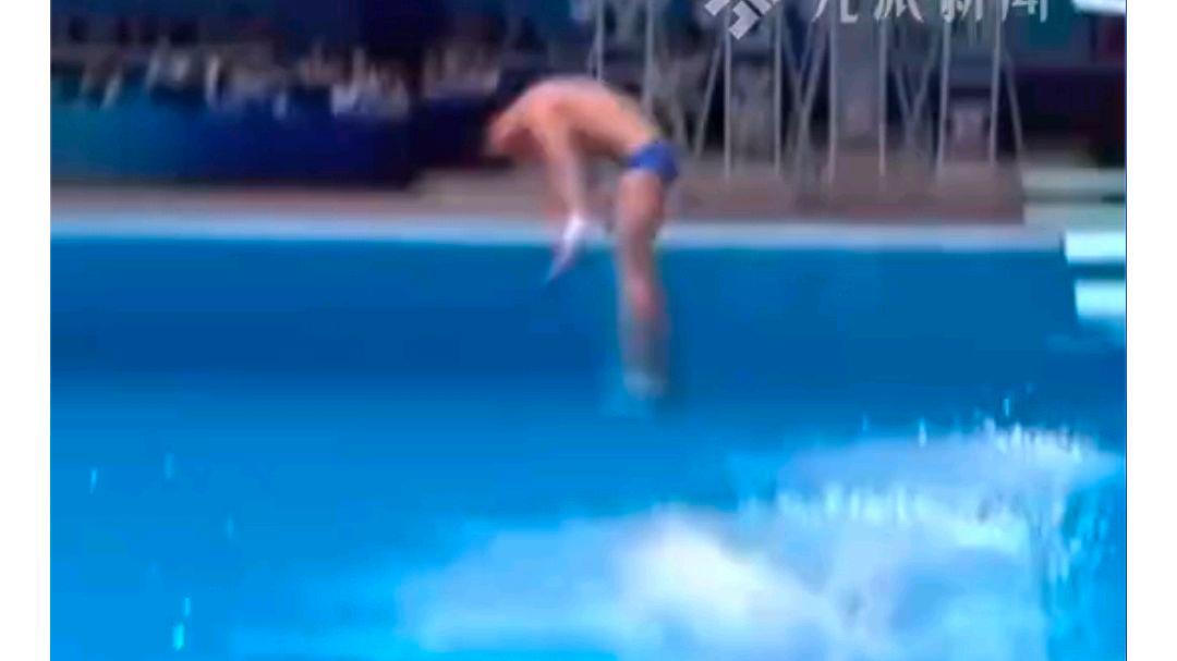 失误情况:赵冬在走板时一脚踏偏,没有成功起跳,直接竖直落入水中。