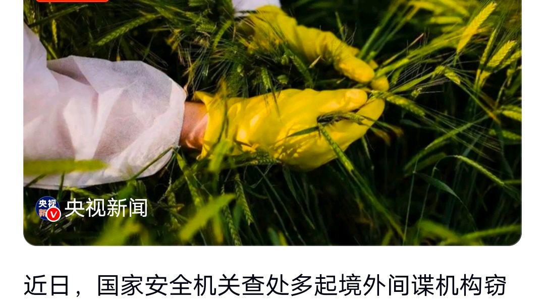 近日,国家安全机关查处多起境外间谍机构窃取我国粮食与种质资源案件。部分人员以“合作制种”“农业调查”为名,非法获取亲本种子和粮食数据。国安部门依法处置涉案人员,重拳斩断伸向田间的窃密黑手,维护国家粮食与种业安全。