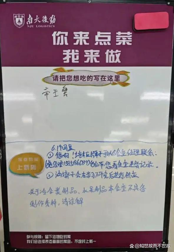 消息传出后,不少人将其与南京大学此前推出的“你来点菜我来做”活动联系起来。网络流传的图片显示,今年6月,有学生在该活动留言板上写下“帝王蟹”三个字。