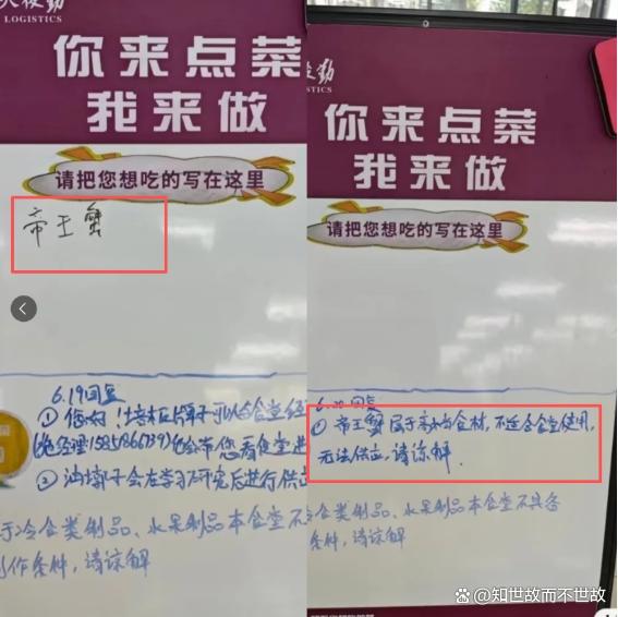 当时食堂的回复是:“帝王蟹属于高档食材,不适合食堂使用,无法供应,请谅解。”