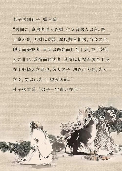 孔子也主张尽孝要“敬不违,劳而无怨”,做事要“成事不说,遂事不谏,既往不咎”,强调忠孝不是做给别人看的,要发自本心。老子送之曰:“吾闻富贵者送人以财,仁人者送人以言。吾不能富贵,窃仁人之号,送子以言,曰:聪明深察而近于死者,好议人者也。