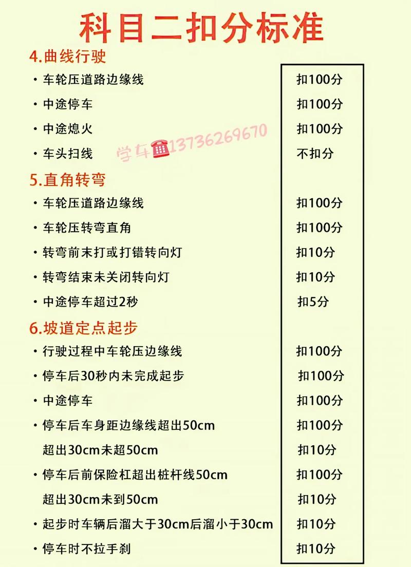 2、驾驶科目二考试,作为机动车驾驶证考核的核心环节,被广大考生所重视。该考试满分为100分,评判标准细分为不合格、减20分、减10分及减5分的项目。对于报考大型客车、牵引车等特定准驾车型的考生,成绩需达到90分;而报考其他车型的考生,则需达到80分才能被判定为合格。