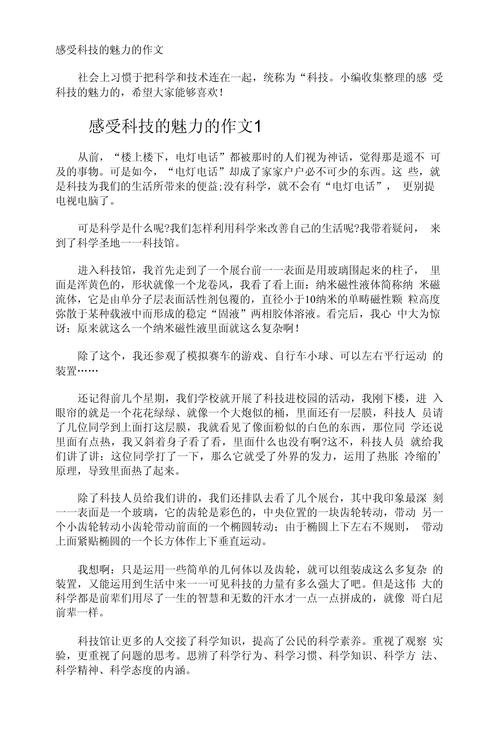 科技的魅力(一)科技是当今社会不可或缺的一部分,其魅力无处不在。首先,科技让我们的生活更加便捷。智能化设备如智能家居能自动控制电器,在线购物、网上支付、在线医疗等便民服务为日常生活带来极大便利。其次,科技让我们的交流更加高效。