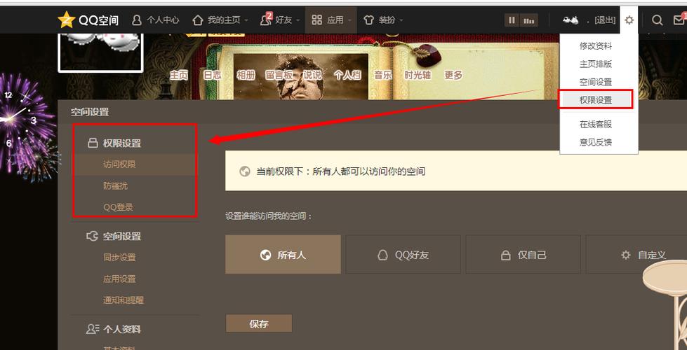 首先,打开你的QQ空间页面。将鼠标移动至页面右上方的“设置”按钮上,这个按钮通常以一个齿轮图标表示。选择权限设置:在弹出的下拉菜单中,选择“权限设置”选项。自定义访问权限:在权限设置页面中,找到并点击“自定义”选项。这将允许你进一步细化谁可以访问你的空间以及访问的条件。
